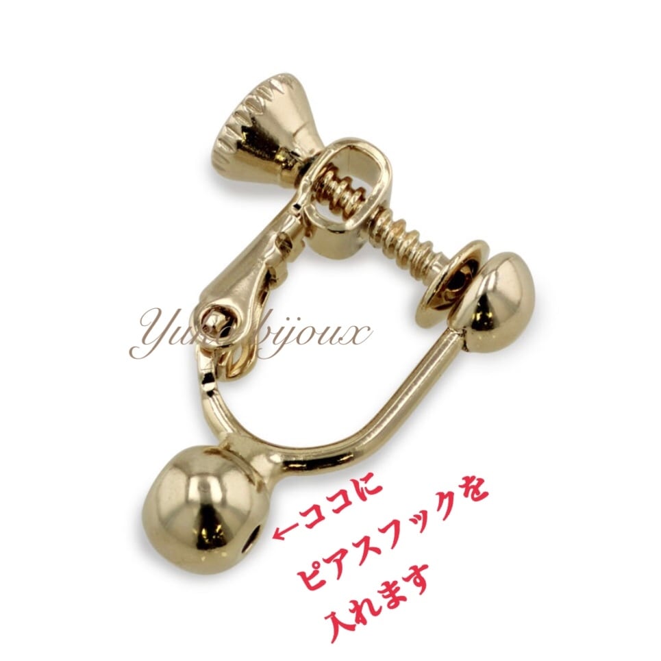 ポスト・フックタイプなどのピアスをゴム入りのボール部分に差し込んで使用します。ネジで微調整ができるバネ式のイヤリング金具です。